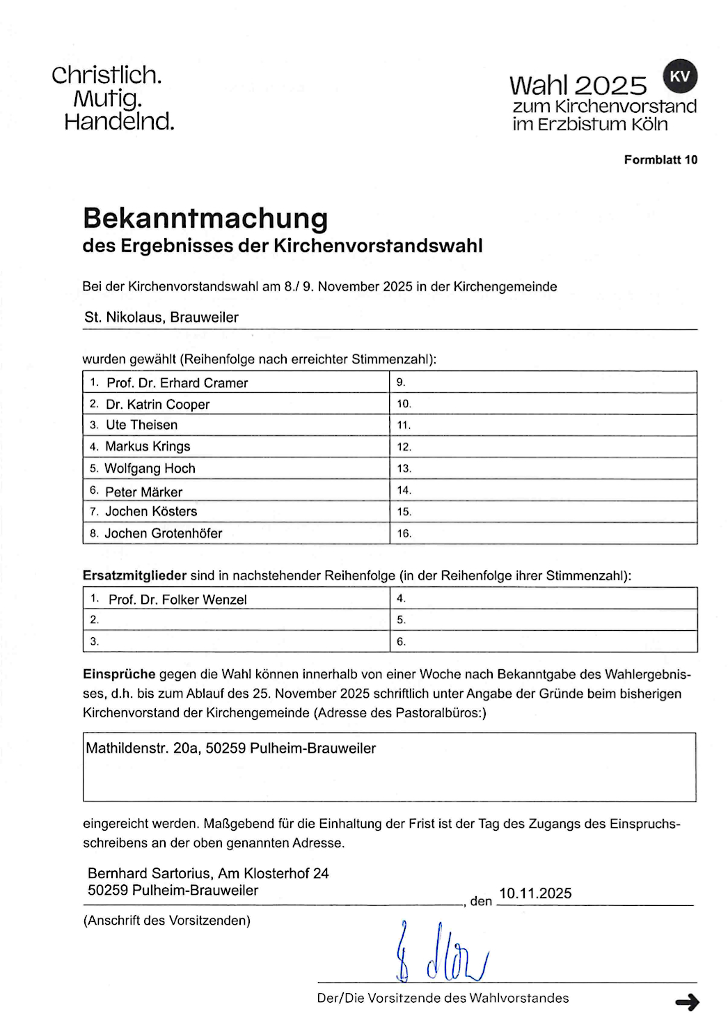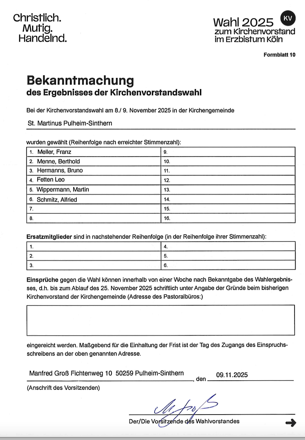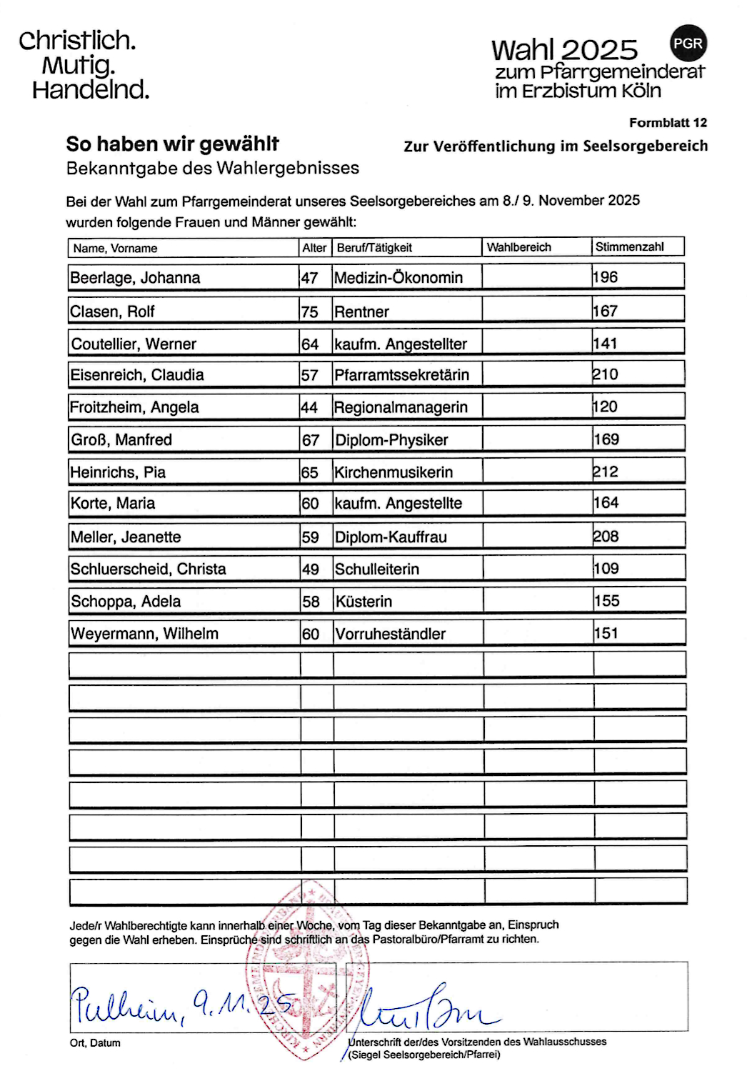 Sehr geehrte Damen und Herren, liebe Engagierte in Gremien und Gruppierungen unserer Kirchengemeinden, liebe Mitchristen, in dem seit Ende 2022 laufenden Prozess zur Bildung der Pastoralen Einheit Pulheim gibt es nun eine einhellige Entscheidung aller Gremien und eine klare Perspektive für die Zukunft: Zum 1.1.2027 werden alle Kirchengemeinden der Pastoralen Einheit zu einer gemeinsamen, neuen Kirchengemeinde: ...