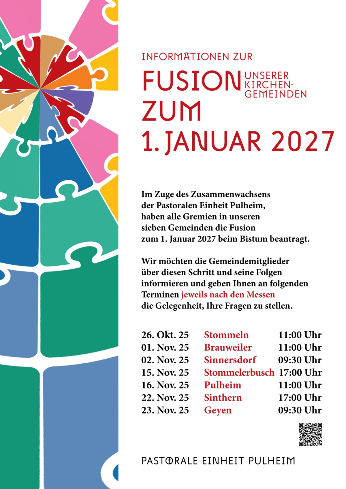 Zum 1.1.2027 werden alle Kirchengemeinden der Pastoralen Einheit zu einer gemeinsamen, neuen Kirchengemeinde: St. Nikolaus Brauweiler, St. Martinus Sinthern, St. Cornelius Geyen, St. Martinus Stommeln, St. Bruno Stommelerbusch, St. Hubertus Sinnersdorf und St. Kosmas und Damian Pulheim. Unsere neue, gemeinsame Kirchengemeinde soll St. Benedikt heißen. Die bisherigen Kirchengemeinden werden aufgelöst, jeder Kirchort und auch die jeweilige Kirche vor Ort bleiben aber erhalten und behalten auch ihren Namen! …