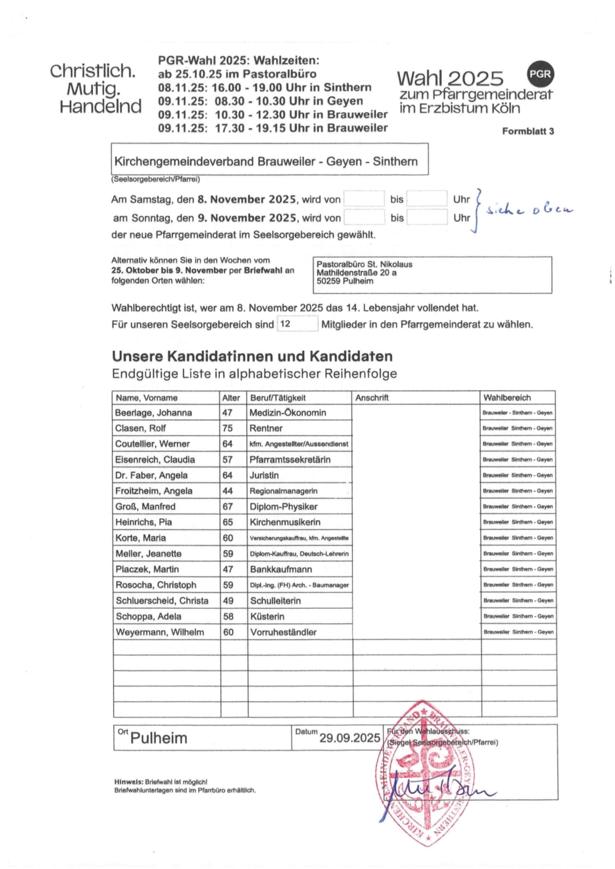 in dem seit Ende 2022 laufenden Prozess zur Bildung der Pastoralen Einheit Pulheim gibt es nun eine einhellige Entscheidung aller Gremien und eine klare Perspektive für die Zukunft: