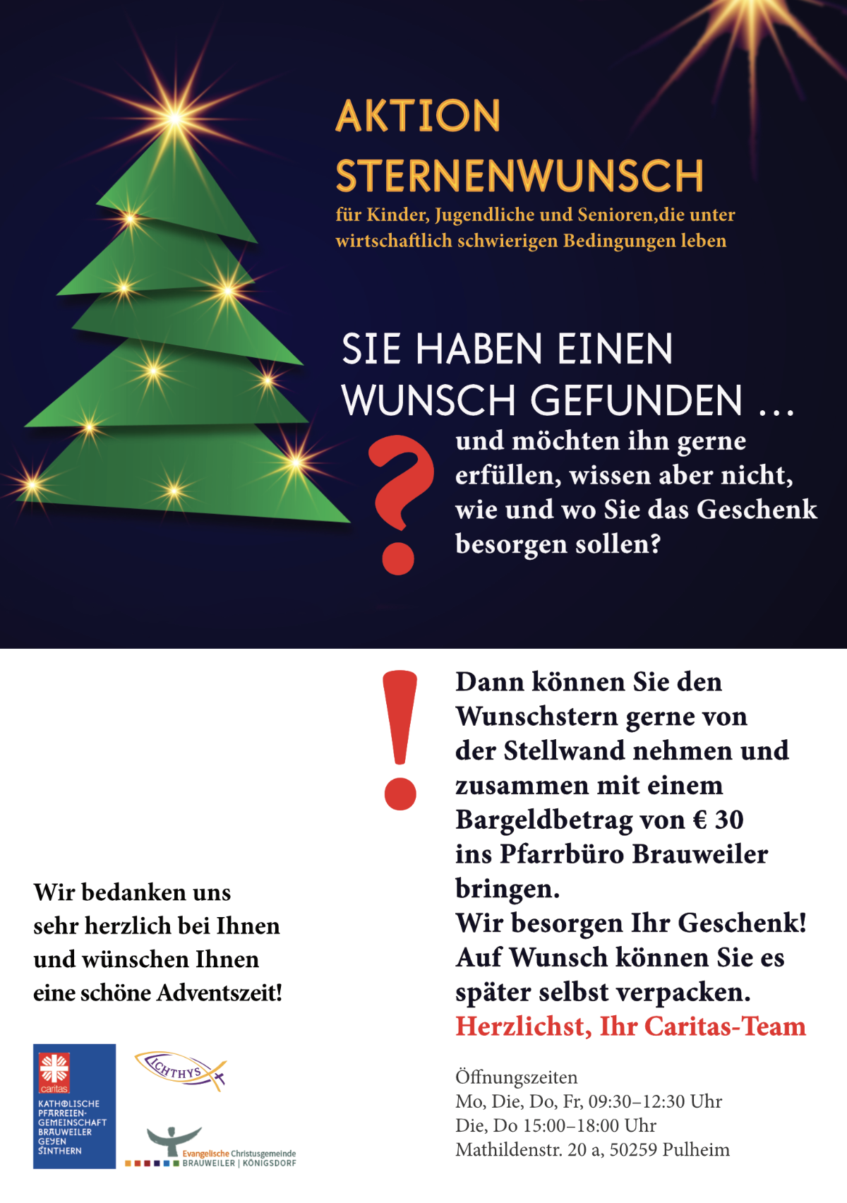 Der lebendige Adventskalender findet wie jedes Jahr vom 1. bis 23. Dezember jeweils um 18:00 Uhr an den im Flyer angegebenen Adressen statt (erhältlich Ende November in den Schriftenständen der Kirchen oder hier unten zum Download). Jeder kann sein Fenster nach seinen Vorstellungen gestalten. Es beginnt mit einem Impuls und dann steht die Begegnung im Vordergrund, Zeit der Besinnlichkeit in der oft hektischen Vorweihnachtszeit. In diesem Jahr wird der Lotsenpunkt Brauweiler passend zum Projekt für drei Euro eine Tasse mit dem Slogan „gemeinsam statt einsam“ zum Verkauf anbieten – auch zu erwerben im Sachensucherladen in Geyen und in der Bücherstube in Brauweiler.